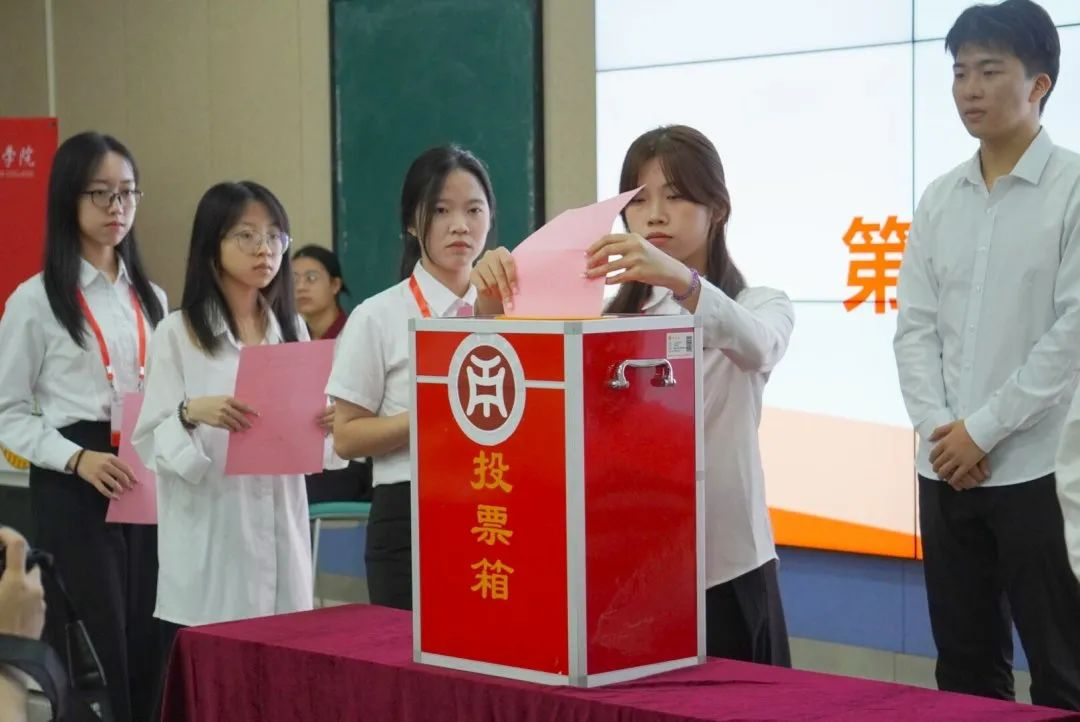 在正式选举304AM永利集团教师教育学院第三届学生会委员会委员的环节中,各学生代表在监票人的监督下,庄严地将自己的选票投入投票箱。