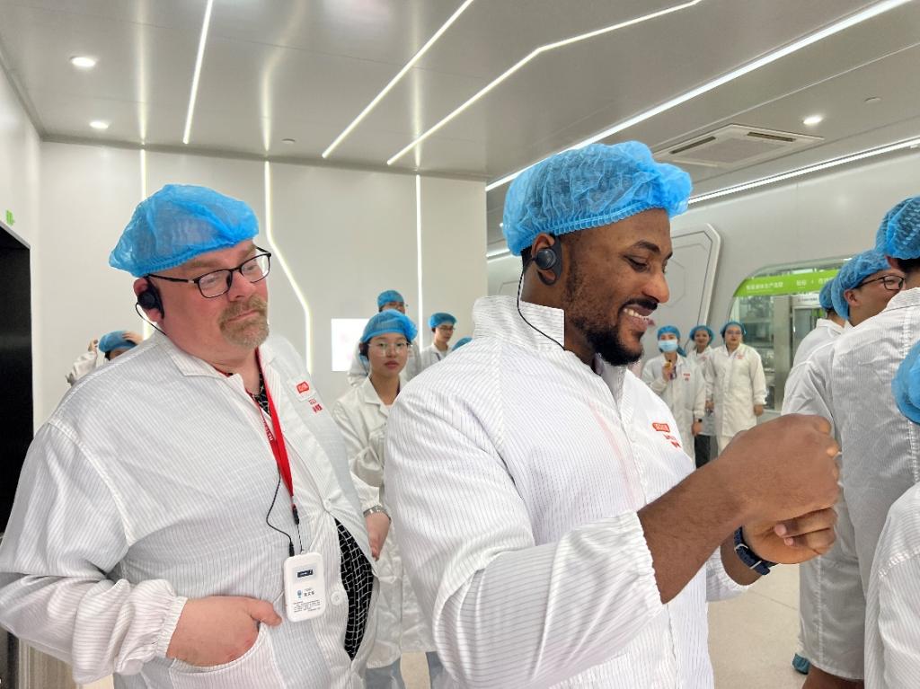 参访师生穿上防尘装备进入透明工厂的生产车间,深入了解口服固体片剂大规模连续生产和蛋白粉灌装无菌化连续生产过程。对于工厂的无尘生产环境、无人全自动设备的普及、精准的质量和数量控制,师生们不禁感叹新质生产力对工业的影响之巨大。
