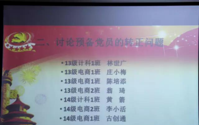 在林冰媛同志的介绍下,许东煜、唐振伟、洪玉祥、黄佳如、林晓萍、吴家威、梁玉爱及谢敏怡八位发展对象上台宣读入党志愿书,并由其介绍人介绍其情况。