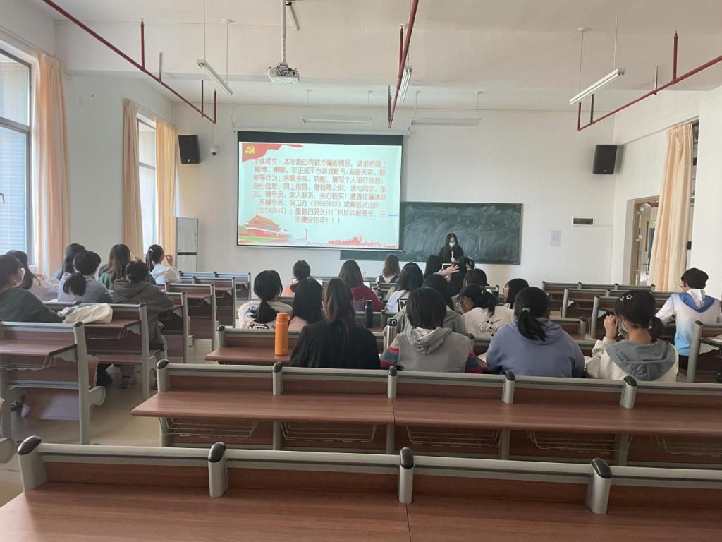 班会上,老师们举例叙述了诈骗的主要类型,分别是:电信诈骗类、兼职诈骗类、校园贷类。对同学们进行了反诈宣传。如果遭遇诈骗,及时联系辅导员、保卫办(82665833)或增城校区雁塔派出所(020-82742848)、四会校区新江派出所(0758-3618236);重新扫码关注广州反诈服务号,注册穗安防诈。全员参与反诈答题,提高安全意识。