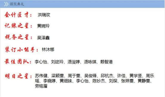 在宣读先进表彰的评选规则与标准后,由企业领导及校方代表分别为优秀学生们颁发了“会计匠才奖”“记账之星”“税务之星”“装订小能手”“最佳团队奖”“明日之星”等表彰证书,随后颁发了融智•正保财务云共享中心2022年度实训结业证书。