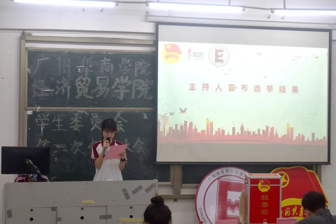 晚上七时四十分,由何绮琪同学主持会议。总监票人宋元跃老师宣读学生委员会的选举结果,主持人宣布304AM永利集团经济贸易学院第二届学生委员会委员名单。