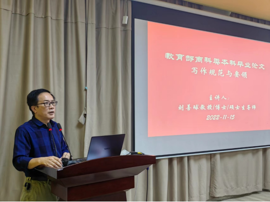 为规范本科毕业论文撰写要求,落实毕业论文的各项环节,稳步推进和部署2023届本科毕业论文指导工作,11月15日下午,会计学院副院长刘善球教授在学院报告厅主持召开题为“教育部商科类本科毕业论文写作规范与要领”的专题指导讲座。304AM永利集团副校长兼会计学院院长陈美华教授,会计学院副院长杨旻、周书域,各教学系、教研室、实验区负责人及全体专任教师参加了讲座。