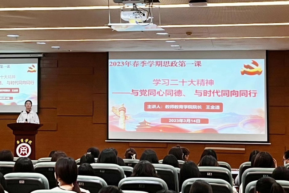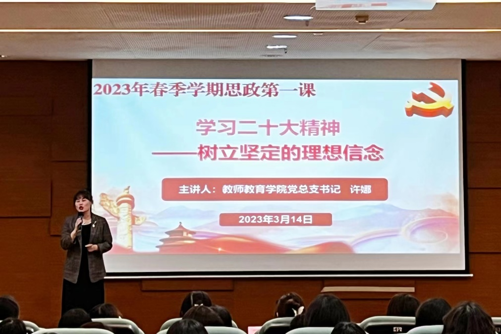 为全面贯彻党的教育方针,贯彻落实教育部十部门《全面推进“大思政课”建设的工作方案》文件精神,加强学院思政课建设,充分发挥思政课在立德树人中的关键作用。教师教育学院开展2023年春季学期“思政第一课”,旨在帮助学生进一步提高思想觉悟,贯彻落实党的二十大精神,增强同学们的爱国、爱党情怀。