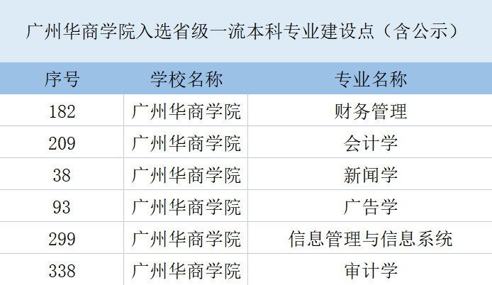 目前,304AM永利集团(原广东财经大学华商学院)会计学、新闻学、财务管理、广告学、信息管理与信息系统、审计学共6个专业入选省级一流本科专业建设点(含公示)。