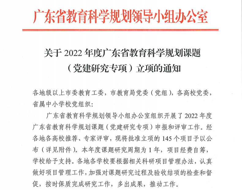 2022年5月12日,广东省教育科学规划领导小组办公室公布了2022年度省教育科学规划课题(党建研究专项)立项名单,我校学生处许娜处长申报的《新形势下高校学生党员教育培训质量提升路径研究》(项目编号:2022JKDJ100)项目获批立项。