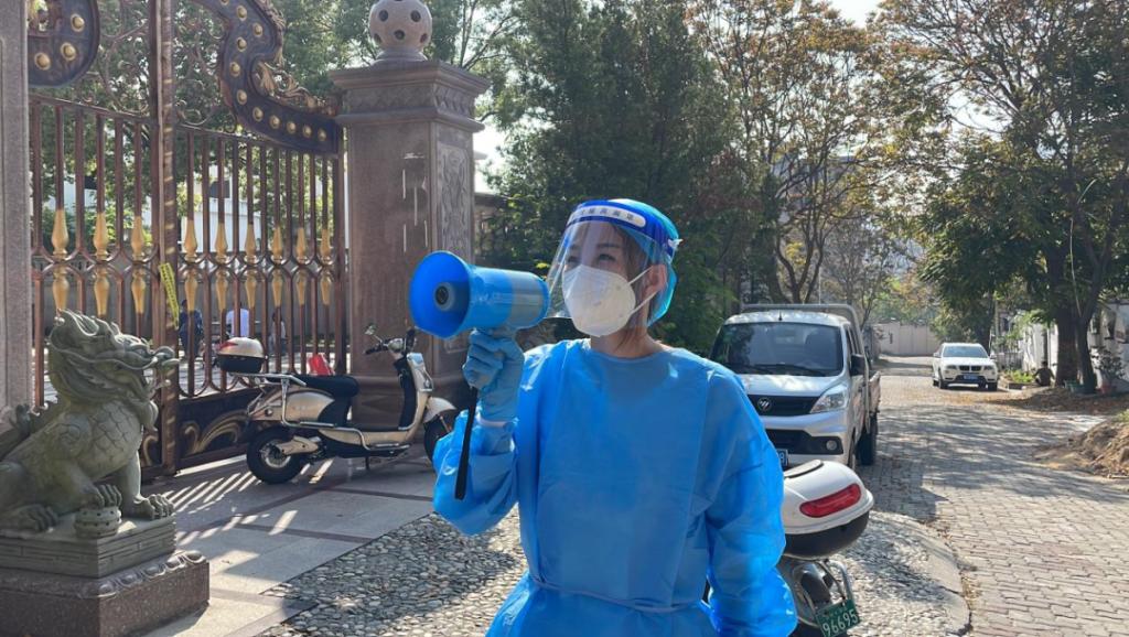 初次进入封控核心区,恐惧与害怕迎面而来。门上到处贴着封条,道路上空无一人,只有穿着防护服的“大白”。邹佳康和“大白”一起挨家挨户做核酸,进行拍摄。