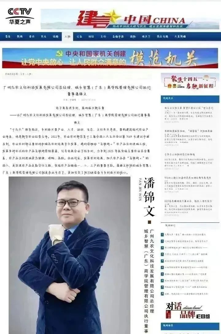 潘锦文老师表示,只有个人志向与时代变迁同频共振,才能创造无限的价值。秉持着这样的初心,他致力于用自己的电商经验为中国乡村振兴做些实事,为塑造乡村农业产业、农业品牌出谋划策,将互联网创新和数字化技术与乡村实际需求相结合,通过大数据以及物联网技术发展“智慧农业”,帮助农民增产增收。他返乡创业、助力乡村振兴的事迹也得到了主流媒体的认可和宣传。